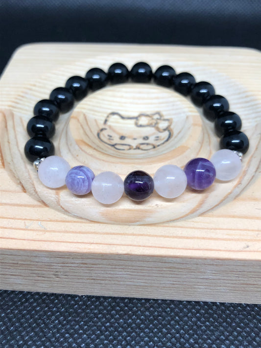 Bracelet Obsidienne, quartz blanc et amethiste serti d'accents argent 9.25